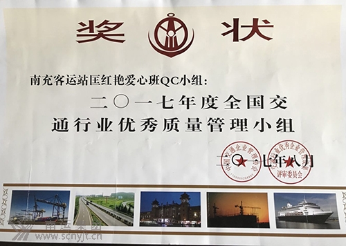 11月11日,全國交通運(yùn)輸行業(yè)質(zhì)量管理活動總結(jié)表彰大會上,南充汽車客運(yùn)站“匡紅艷愛心班”“提高自助化服務(wù)過程中的旅客滿意率”QC小組,交通企業(yè)管理協(xié)會、交通行業(yè)優(yōu)秀企業(yè)管理成果審委員會表彰2017年度全國交通行業(yè)優(yōu)秀質(zhì)量管理小組。
