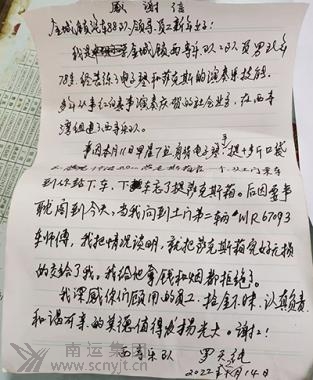 南運(yùn)集團(tuán)儀隴分公司駕駛員余友和物歸原主 收到《感謝信》