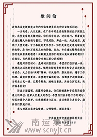 尊敬的市交通運(yùn)輸局黨委: 在投入鄰水緊張的抗疫工作間隙,我們南運(yùn)集團(tuán)奔赴鄰水抗疫一線的22名黨員先鋒隊(duì)駕駛員及領(lǐng)隊(duì),懷著激動地心情傳達(dá)閱讀了市交通運(yùn)輸局黨委給我們發(fā)的既熱情洋溢鼓舞斗志,又充滿溫暖深情牽掛的《慰問信》,讓我們勇氣倍增,更加堅(jiān)定了圓滿完成支援鄰水防疫任務(wù)的信心和決心,在此謹(jǐn)代表南運(yùn)集團(tuán)出征鄰水的全體黨員先鋒隊(duì)駕駛員及領(lǐng)隊(duì)向局黨委的親切關(guān)懷和暖心慰問表示衷心感謝! 請局黨委放心,我們在鄰水抗疫一線,一定不忘初心,牢記使命,只爭朝夕,不負(fù)韶華,聽從當(dāng)?shù)刂笓],服從工作安排,遵守防疫紀(jì)律,落實(shí)防控要求,加強(qiáng)個人防護(hù),確保自身安全,充分展現(xiàn)南充交通人的大愛情懷,上下一心,眾志成城,全力以赴打贏疫情防控殲滅戰(zhàn)!為鄰水防疫工作做出應(yīng)有貢獻(xiàn)! 上下同欲者勝,風(fēng)雨同舟者興。請局黨委相信:在市委市政府的正確領(lǐng)導(dǎo)下,在市局黨委的堅(jiān)定支持下,我們絕不辜負(fù)市局黨委和南充人民的信任重托和殷切希望!堅(jiān)決確保圓滿完成上級黨組織交給我們的抗疫運(yùn)輸保障光榮任務(wù)!為南充人民爭光!為南充交通爭光! 此致敬禮!