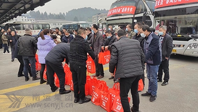 蓬安縣就業(yè)局農(nóng)民工服務(wù)中心主任張宇帶領(lǐng)工作人員為返崗農(nóng)民工送行,為每一位乘車人員送上了面包、礦泉水等暖心慰問品,并祝福他們平安到達,讓返崗農(nóng)民工切實感受到政府與企業(yè)的關(guān)懷和溫暖。