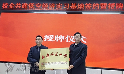 西華師范大學(xué)校黨委常委、副校長(zhǎng)龍漢武(左),向南運(yùn)集團(tuán)董事長(zhǎng)王希平(右)授予“西華師范大學(xué)低空經(jīng)濟(jì)實(shí)習(xí)基地”牌匾。