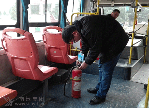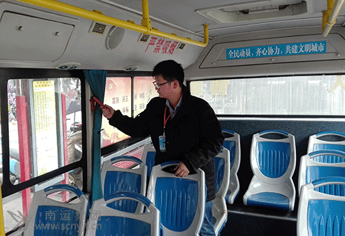 西充宏達(dá)公共交通有限公司安全管理人員檢查車載滅火器和安全錘情況。