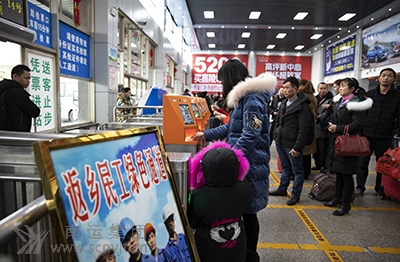 售票大廳里旅客購票秩序井然。7個售票窗口排著購票的旅客隊伍。車站網(wǎng)上購票的旅客已增加到約占一半。在四川汽車票務(wù)網(wǎng)兩名工作人員和1名“小紅帽”站務(wù)人員的引導(dǎo)下,絡(luò)繹不絕的旅客在10臺自助(售)取票機前便捷的。ㄙ彛┢。為了方便農(nóng)民工回家返崗,車站專門設(shè)置了農(nóng)民工服務(wù)臺,農(nóng)民工優(yōu)先售票窗口,農(nóng)民工檢票進站綠色通道,車站工作人員熱情為農(nóng)民工提供指路、購票、咨詢、搬運行李、維護秩序等服務(wù),深受農(nóng)民工歡迎。