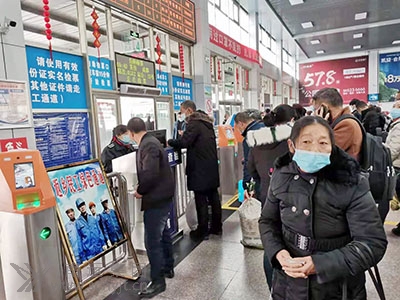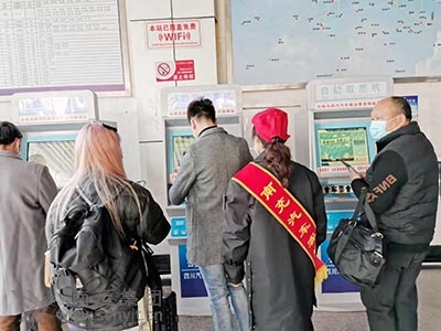 與以往熙熙攘攘、摩肩接踵的景象不同,空曠的售票大廳里,返崗的旅客掃碼、測溫、保持間距,喧囂不再,但一切井然有序。3個售票窗口有三三兩兩的旅客在購票。車站網(wǎng)上購票的旅客已增加到60%。在1名“小紅帽”站務人員的引導下,旅客們在10臺自助(售)取票機前便捷的。ㄙ彛┢。另1個廣東、深圳、汕頭、福建、溫州的售票窗口基本上無人問津。為了方便農民工回家返崗,車站專門設置了農民工服務臺、農民工優(yōu)先售票窗口和農民工檢票進站綠色通道,車站工作人員熱情為農民工提供指路、購票、咨詢、搬運行李、維護秩序等服務,深受農民工歡迎。
