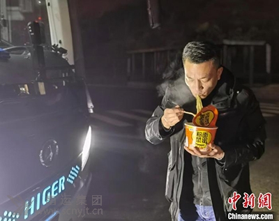 中新網(wǎng)南充1月22日電 (王爵 楊波)21日,是農(nóng)歷大年三十;楊洪,今年46歲,是廣東至四川南充線一名長(zhǎng)途客運(yùn)司機(jī),是他安全完成春運(yùn)任務(wù)的16個(gè)年頭,21日19時(shí)20分左右,楊洪順利到達(dá)重慶武隆服務(wù)區(qū)后,抓緊吃了碗泡面,外加了兩個(gè)鹵雞蛋,這就是楊洪今年的年夜飯。