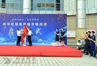 閬中古城機(jī)場黨委書記、董事長李廣平(左)與南運(yùn)集團(tuán)南部分公司經(jīng)理周全(右)為設(shè)在南部汽車客運(yùn)站的閬中古城機(jī)場南部城市候機(jī)樓揭牌。